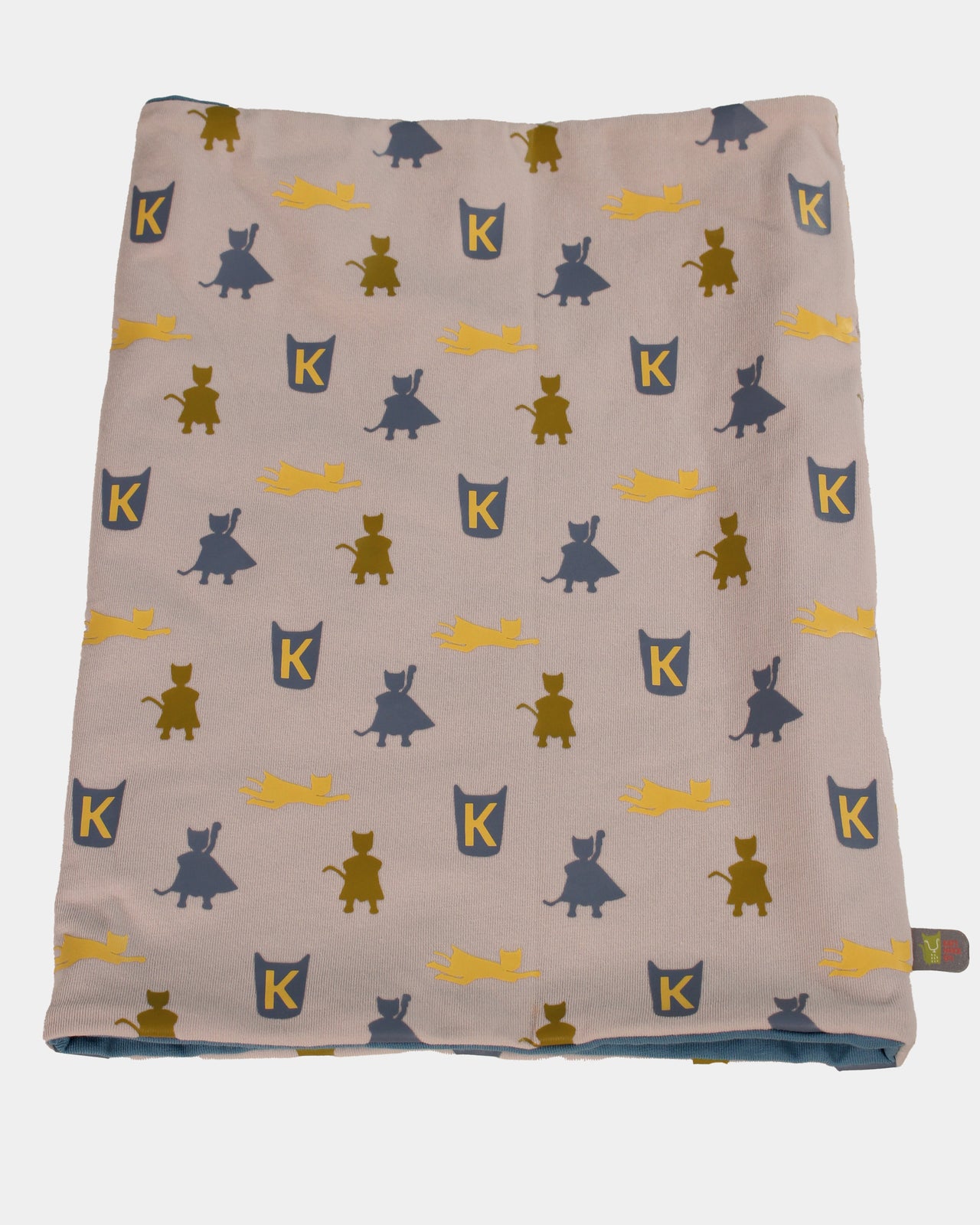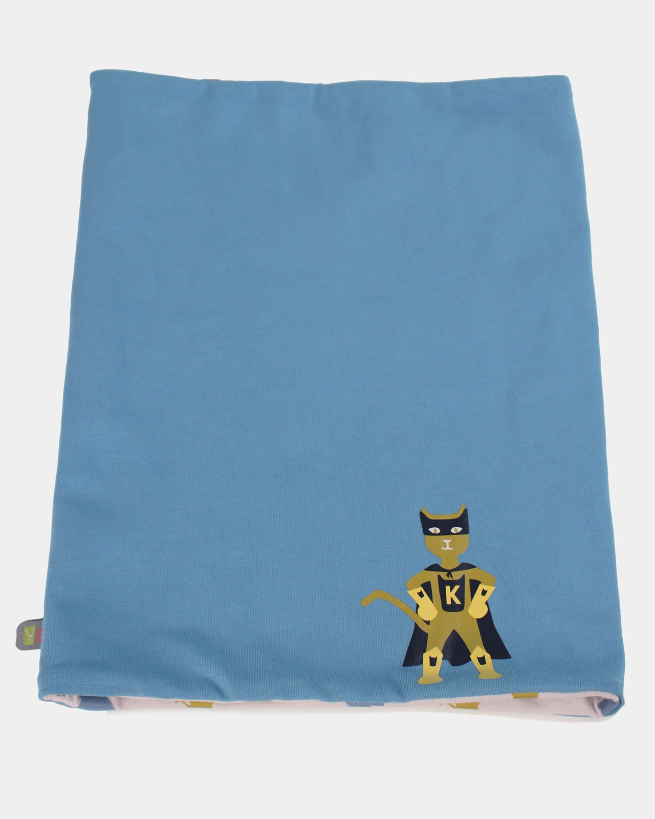 Hals/Buff i mjuk bomull med print frå kolleksjon "Superkatten - 2026" som kan vendast og brukast på begge sider.