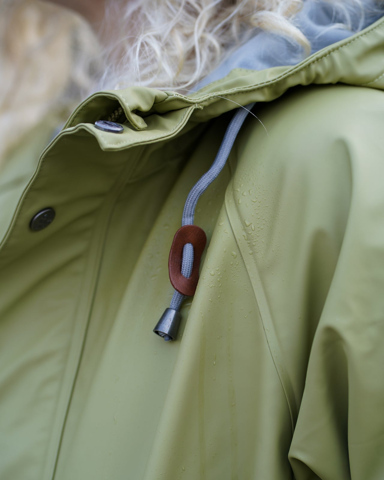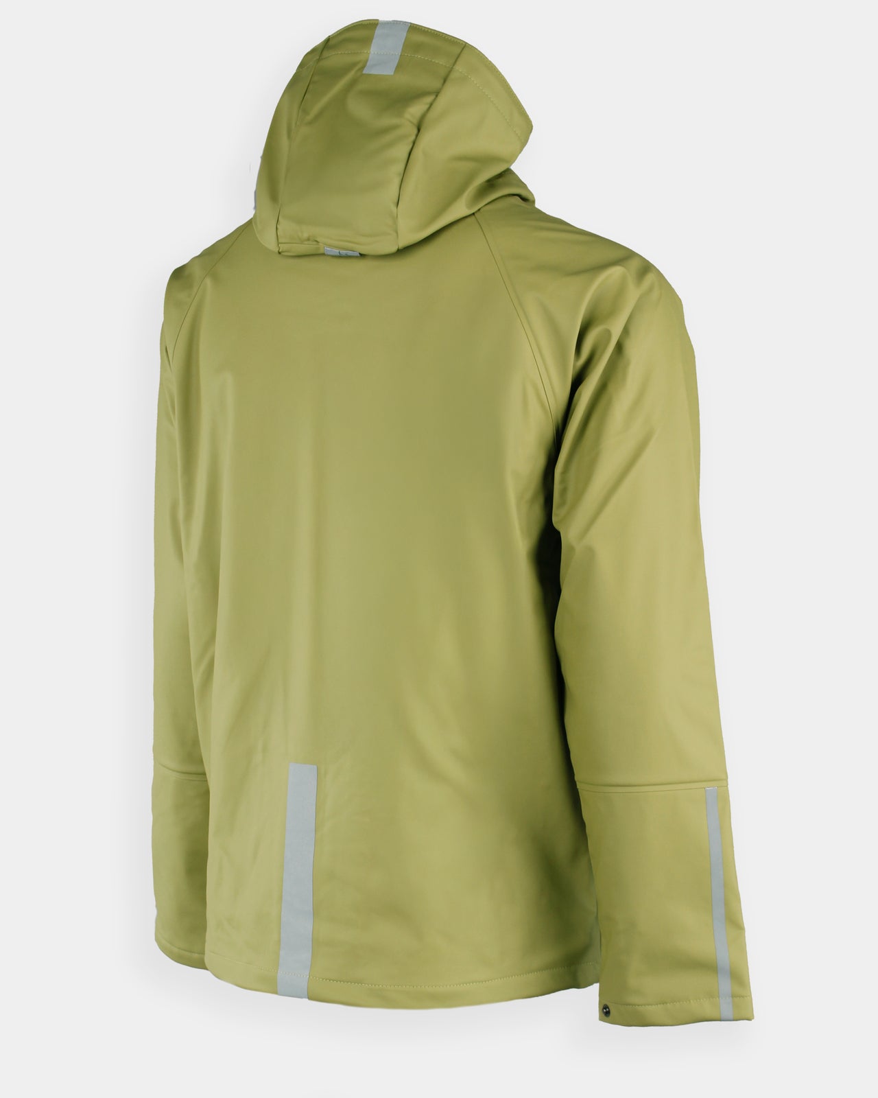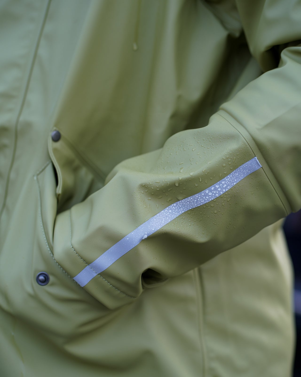 Fortsatt med vannstopper, knappar på ermer, enkel-glidelås, knappar og mobillomme. Hetta er fôra med regntøystoff. Laga i vanntett PU-materiale med børsta innside som gjer at den er mjuk og behageleg å ha på.