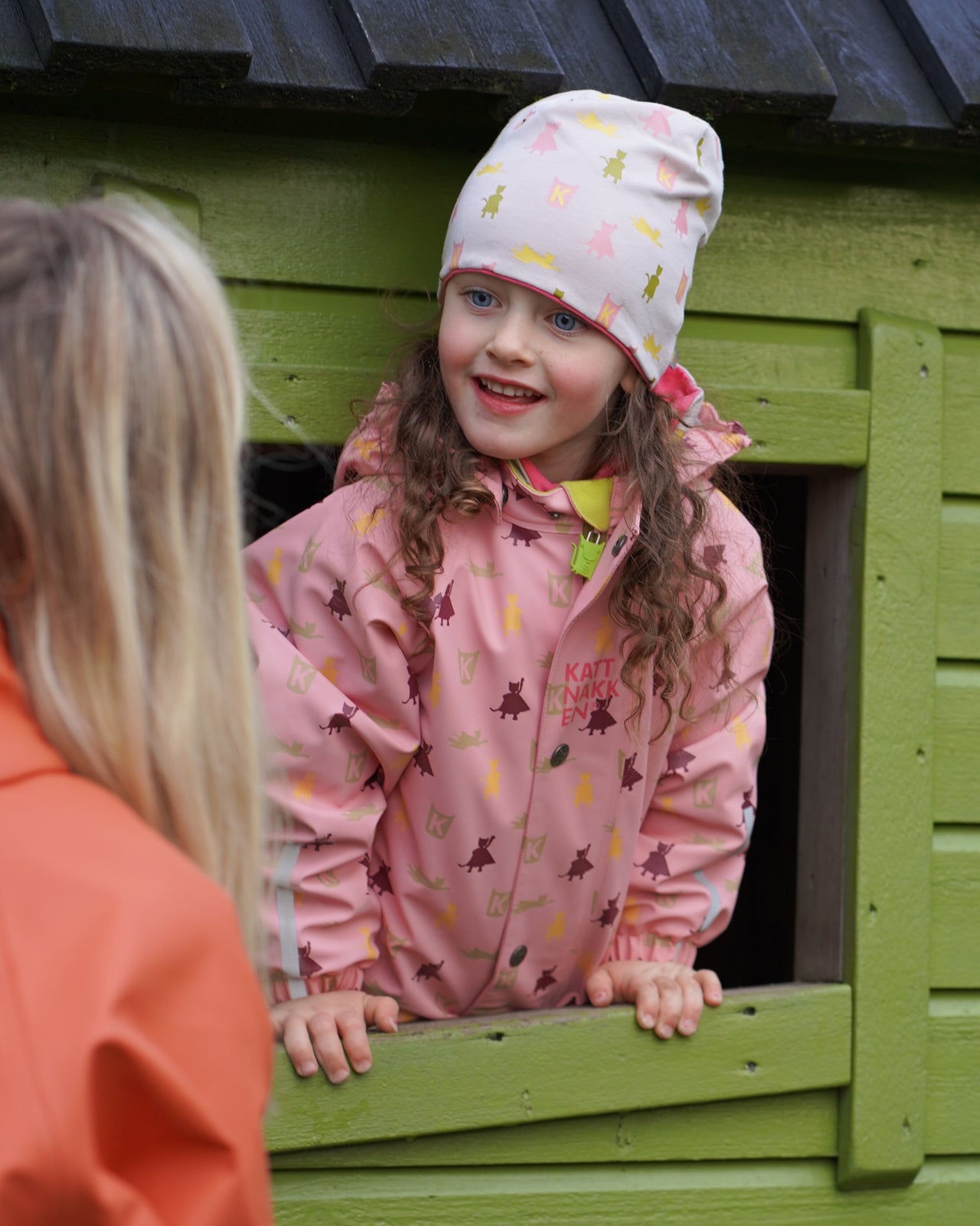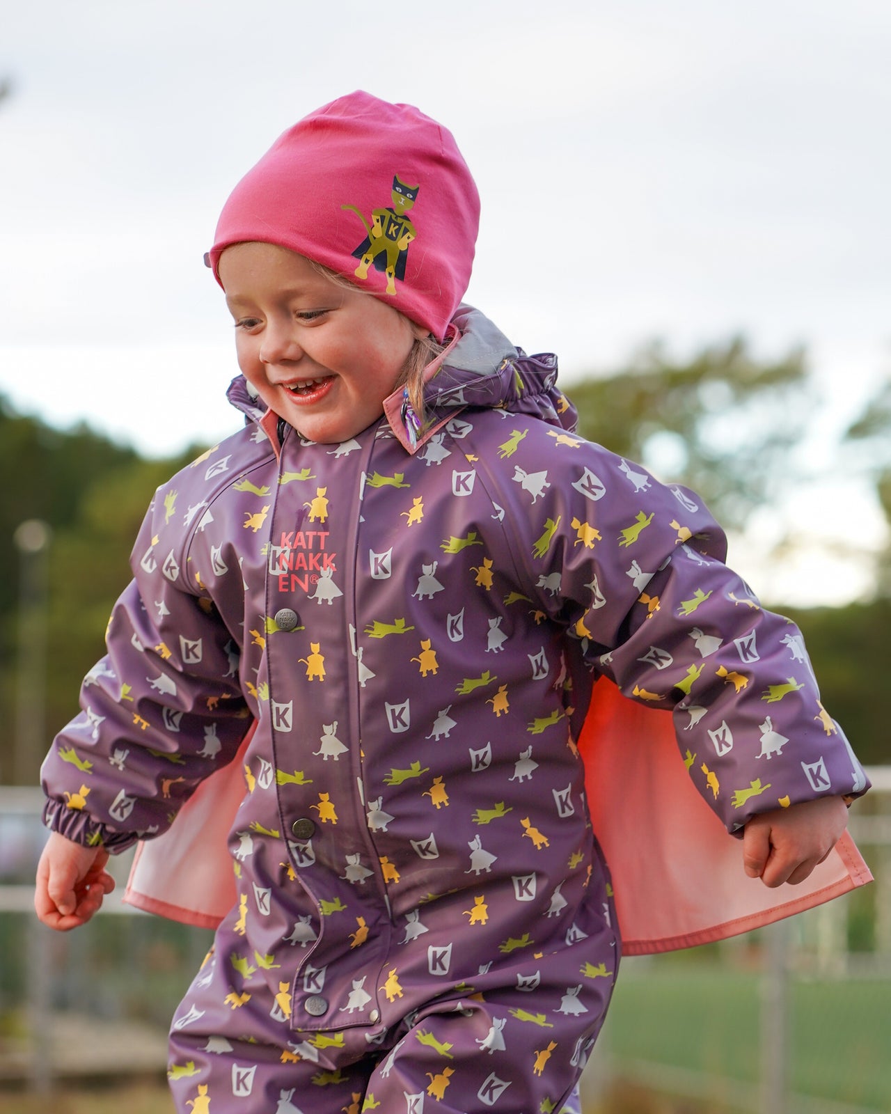 Mjuk bomullslue med print frå kolleksjon "Superkatten - 2026" som kan vendast og brukast på begge sider.