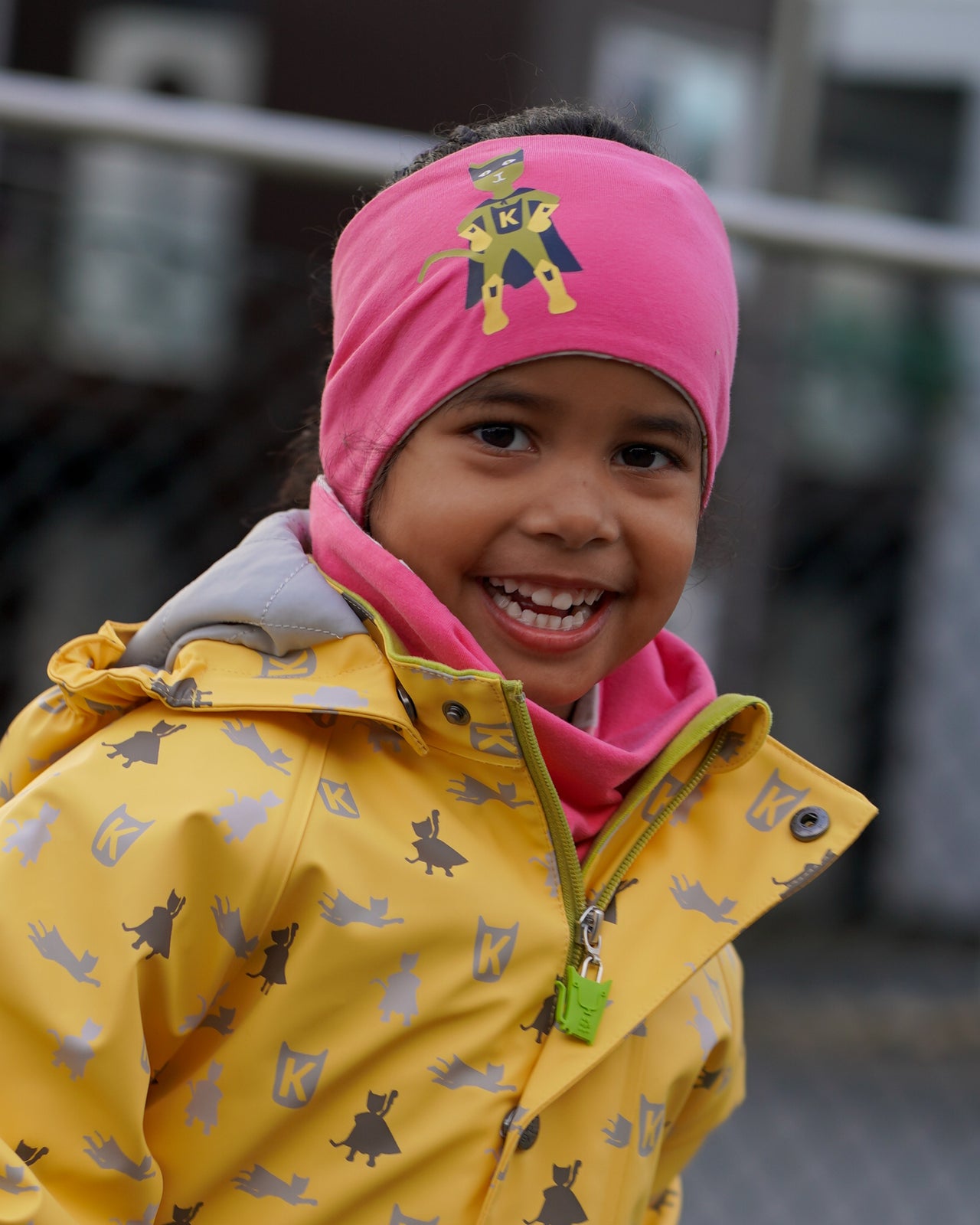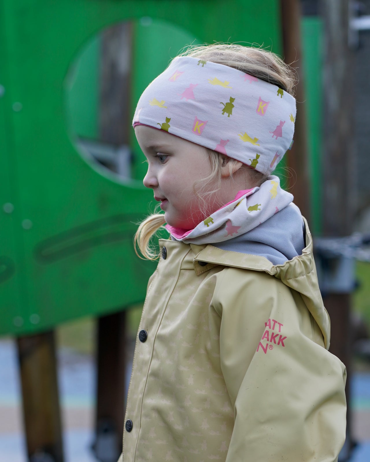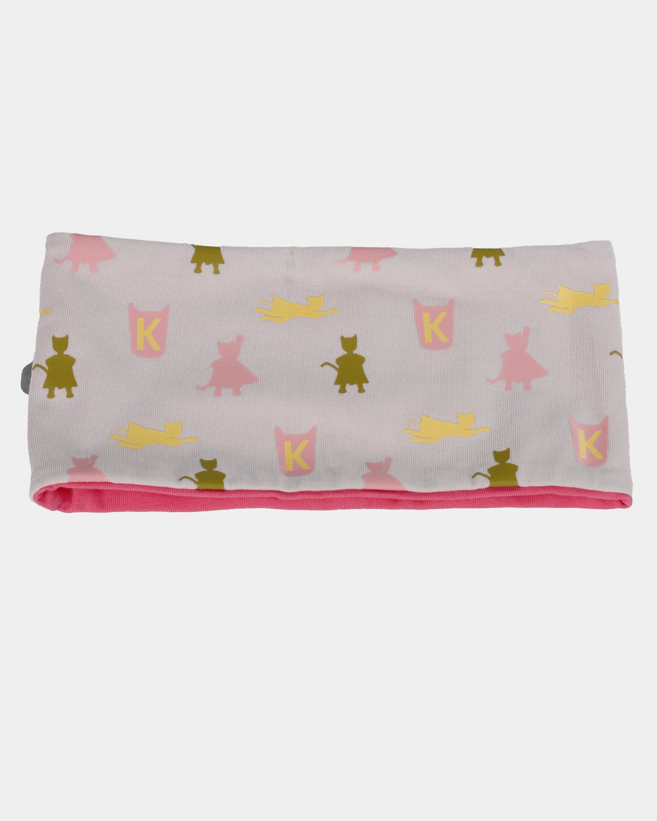 Panneband i mjuk bomull med print frå kolleksjon "Superkatten - 2026". Pannebandet kan vendast og brukast på begge sider.