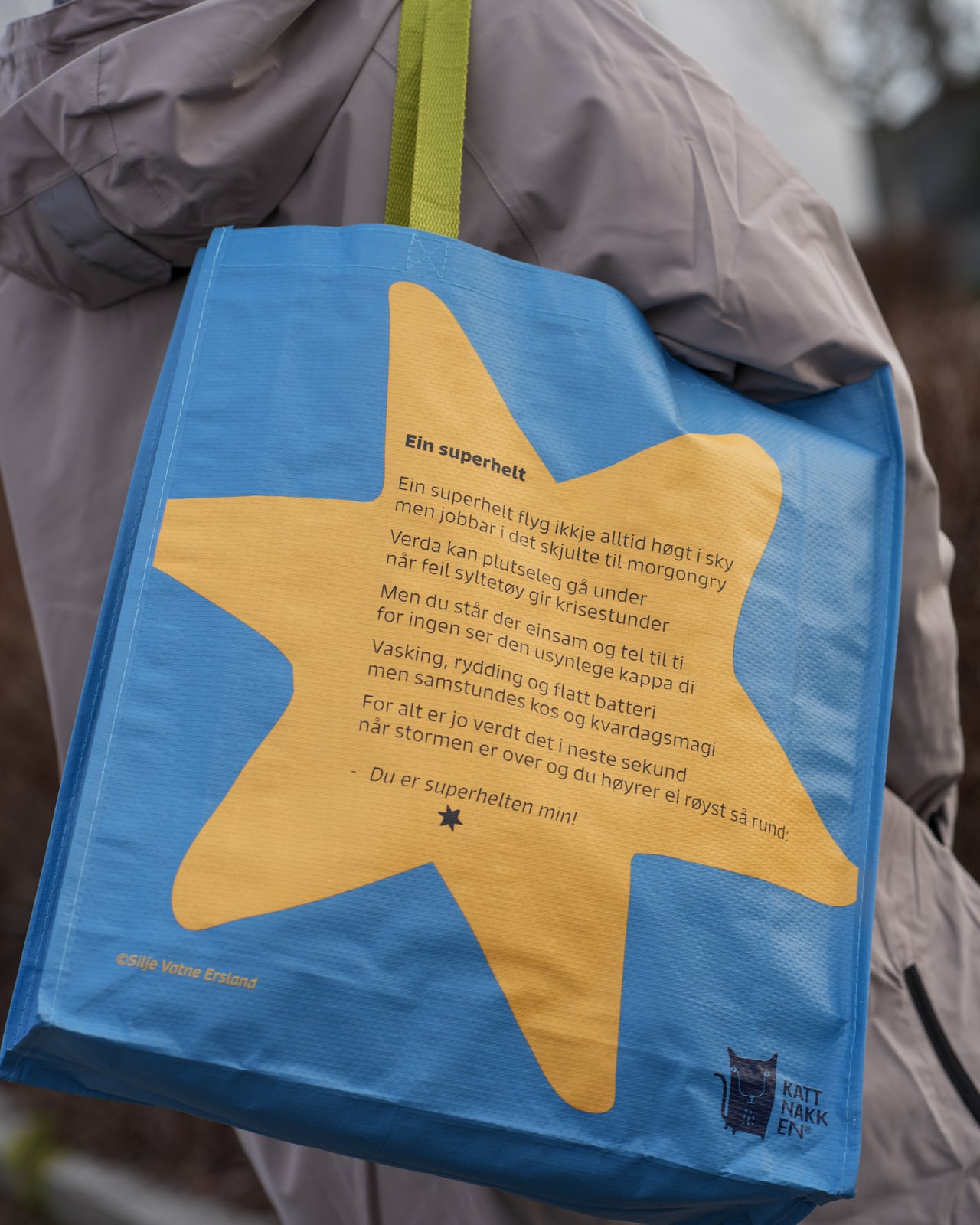 Ein superpraktisk pose til skiftetøy, småting, turar – og shopping! Dei robuste skulderreimene gjer handleturen til ein draum. Posane kjem no i Superhelt-design, med artige teikningar framme og eit lite kolleksjonsdikt på baksida.