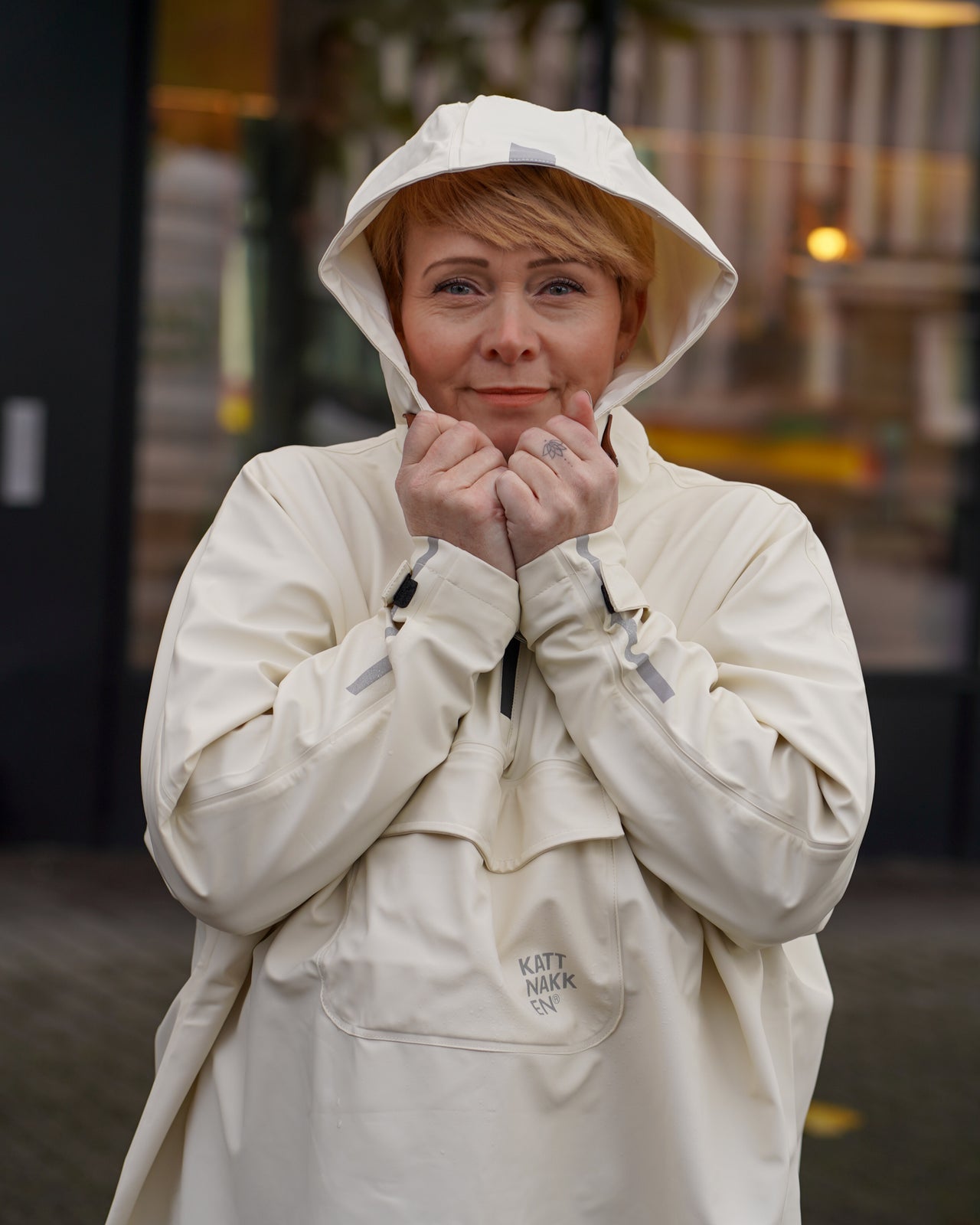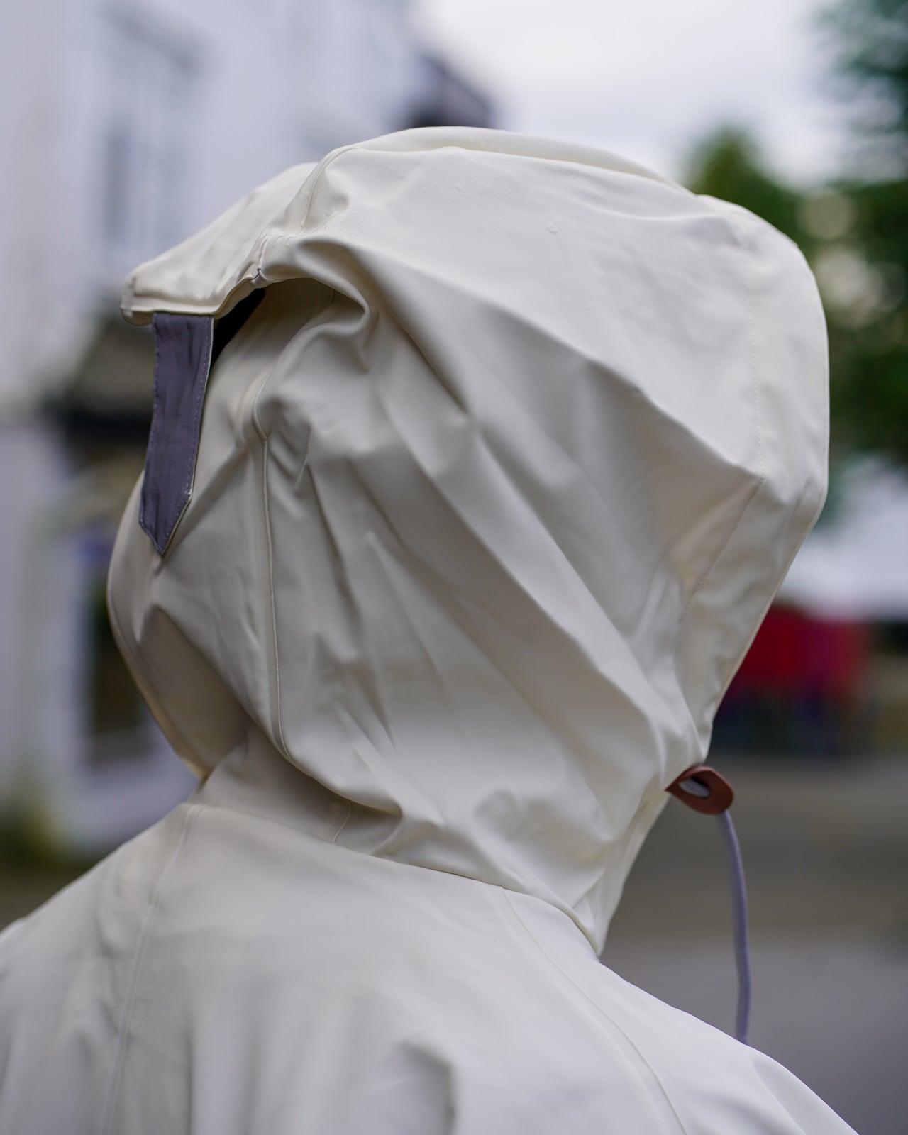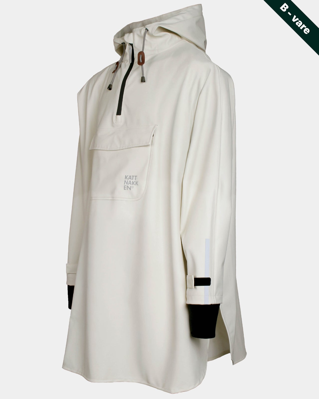 NB! Den kvite (Snø) ponchoen har fått eit lite merke i produksjonen, det er eit svakt avtrykk frå skinnlappen frå snorene på hetta (sjå bilde). Dette påverkar ikkje kvaliteten eller funksjonen til plagget, berre utsjånaden i eit lite område.