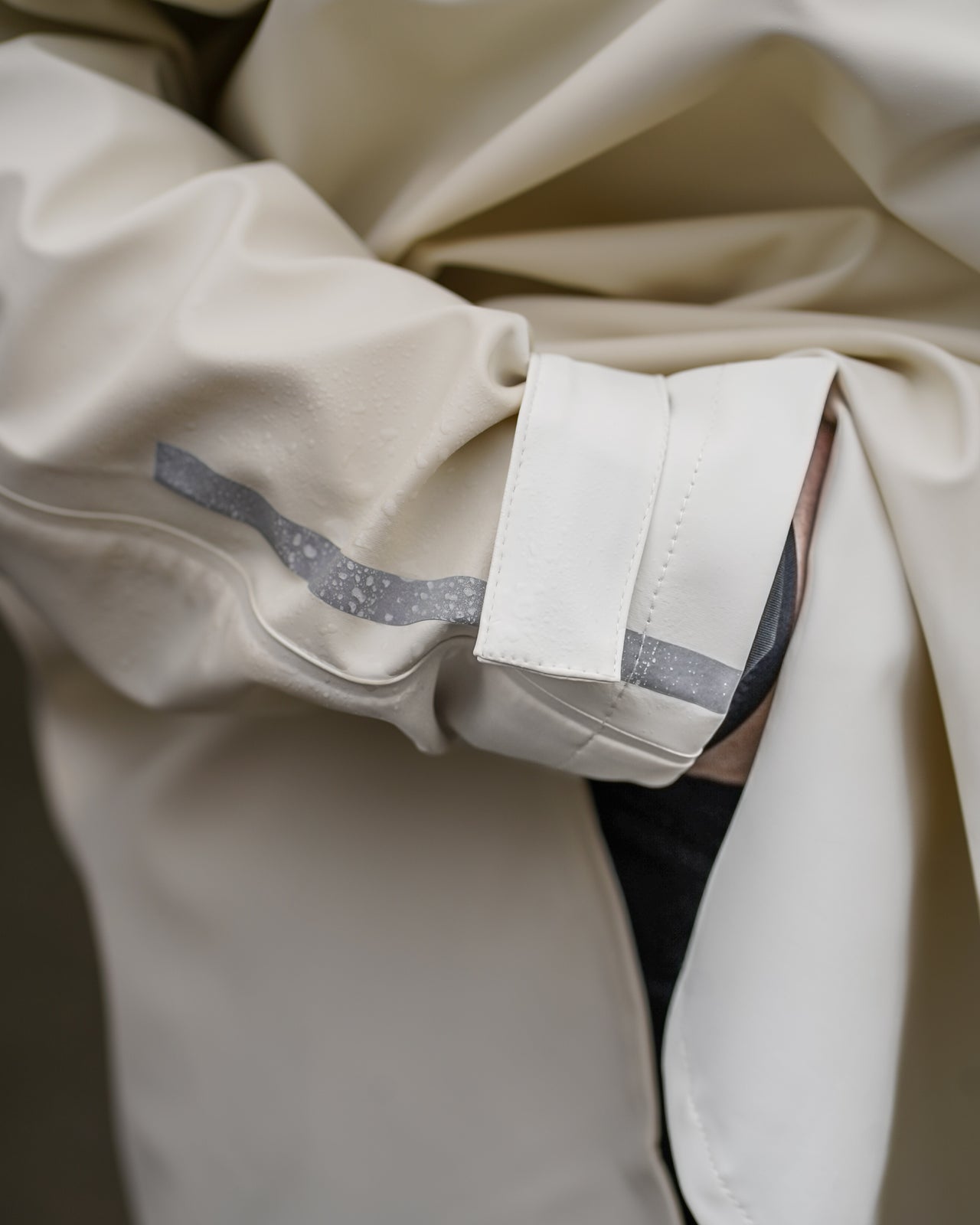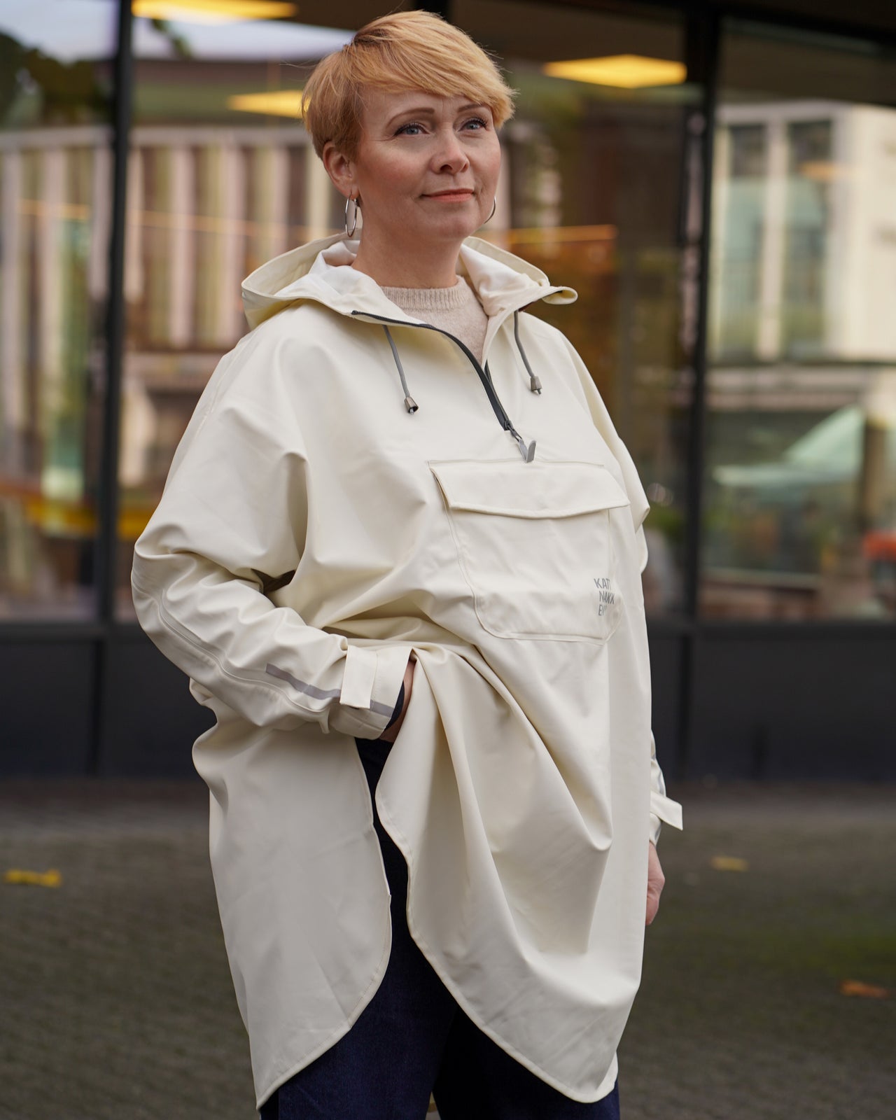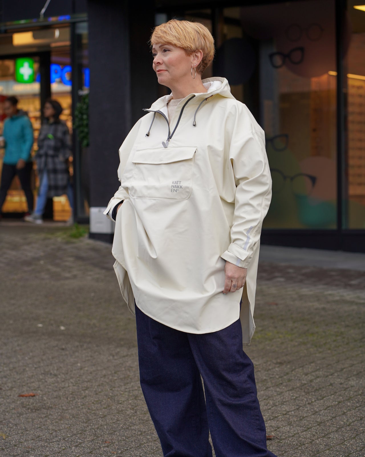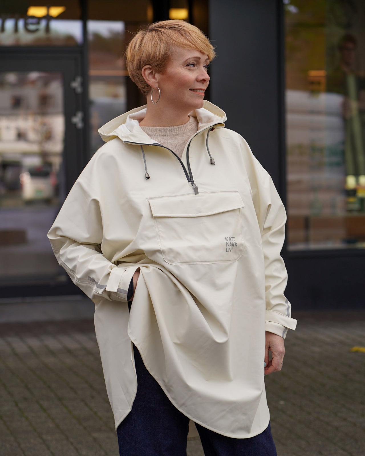 Regnponcho med ermer i mjuk PU knit som gir fint fall. Passformen er laus og størrelsane gode. Dette gjev moglegheit til betre bevegelse, utan at ponchoen flaksar avgårde om du tildømes er ute å syklar.