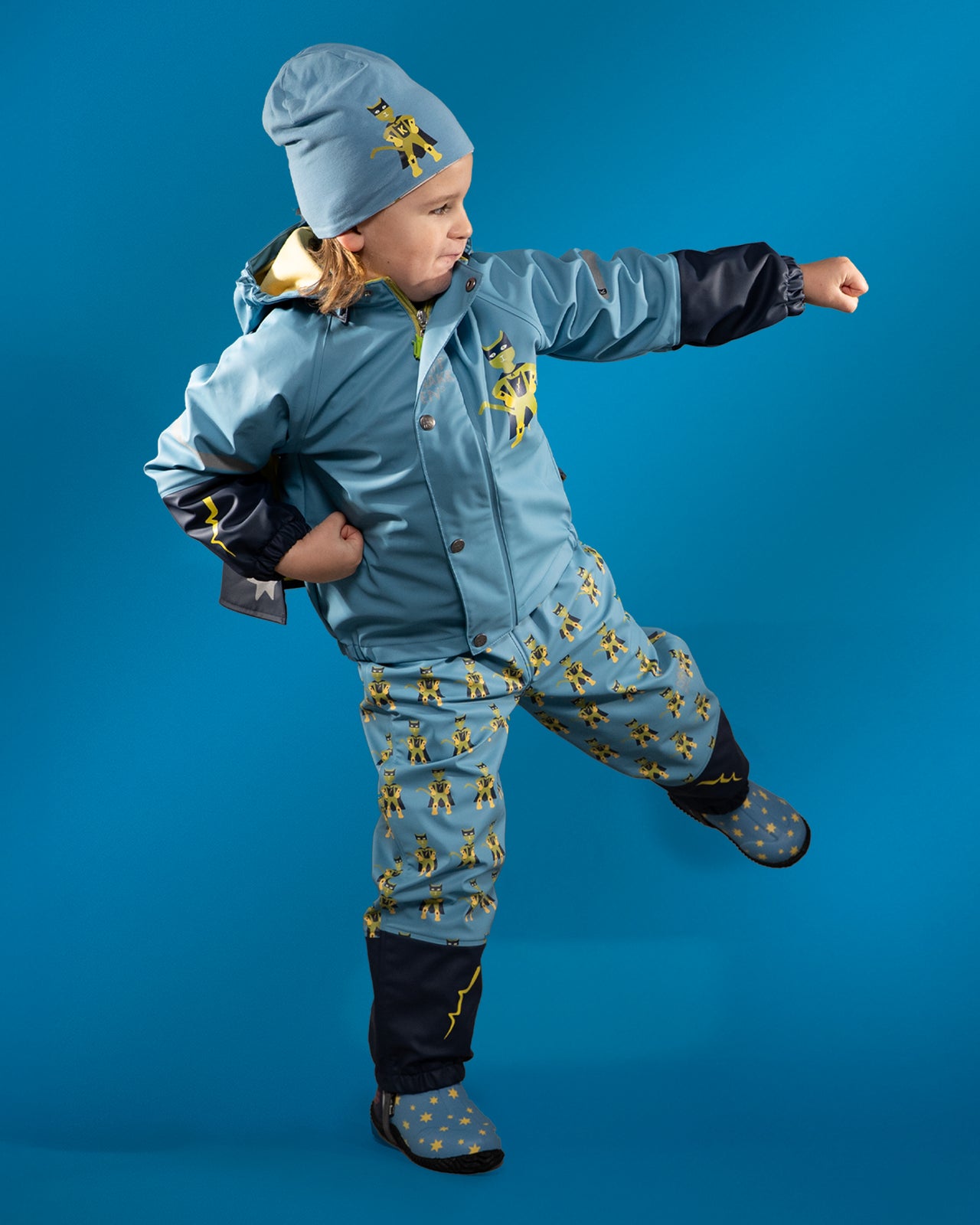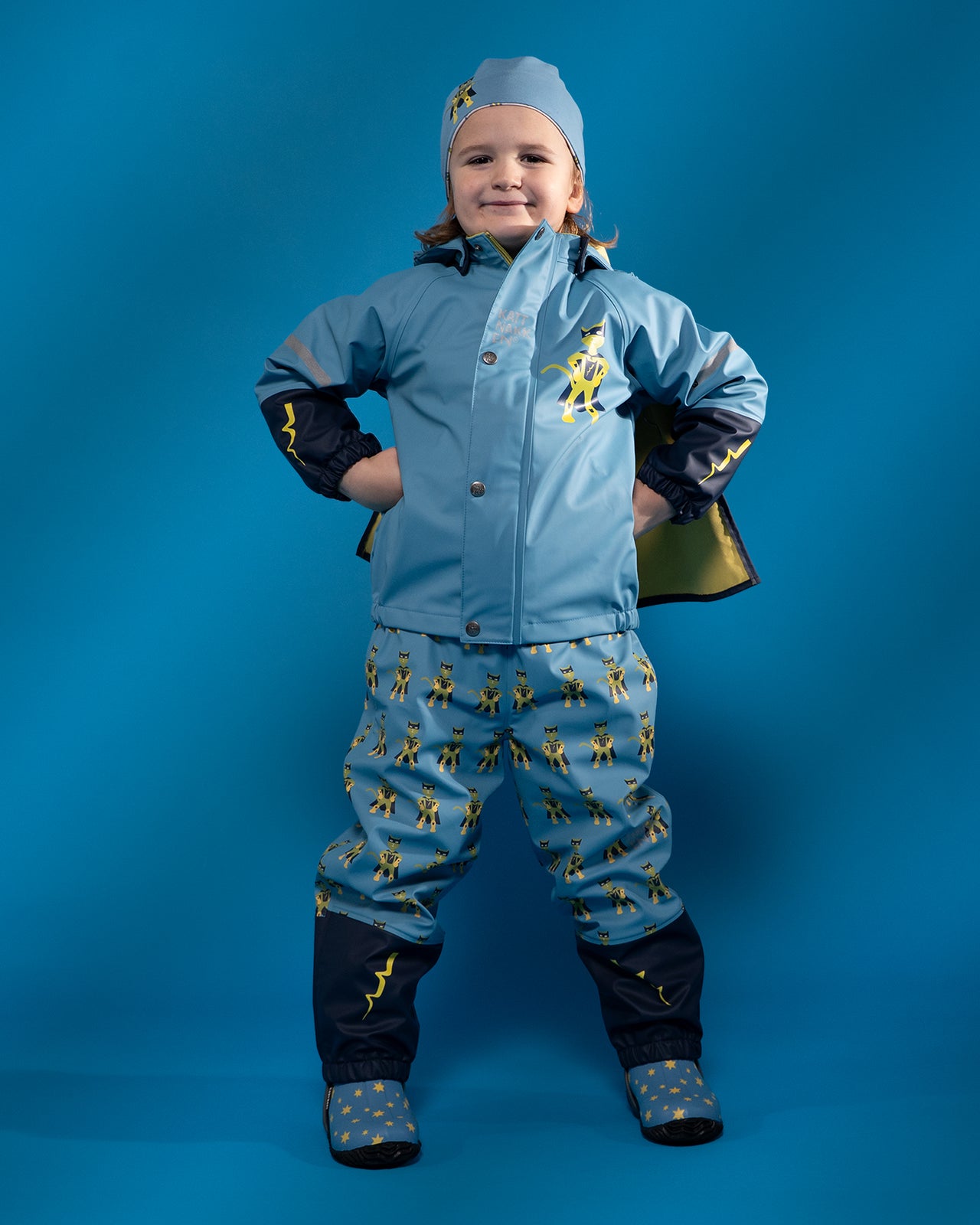 Nyheit! Regnsett Plask Superhelt kolleksjon "Superkatten 2026" - med eigen superheltkappe! Sjå kor stilig! Her blir det leik, fart og regnglede på sitt beste når dei små spring rundt som superheltar.
