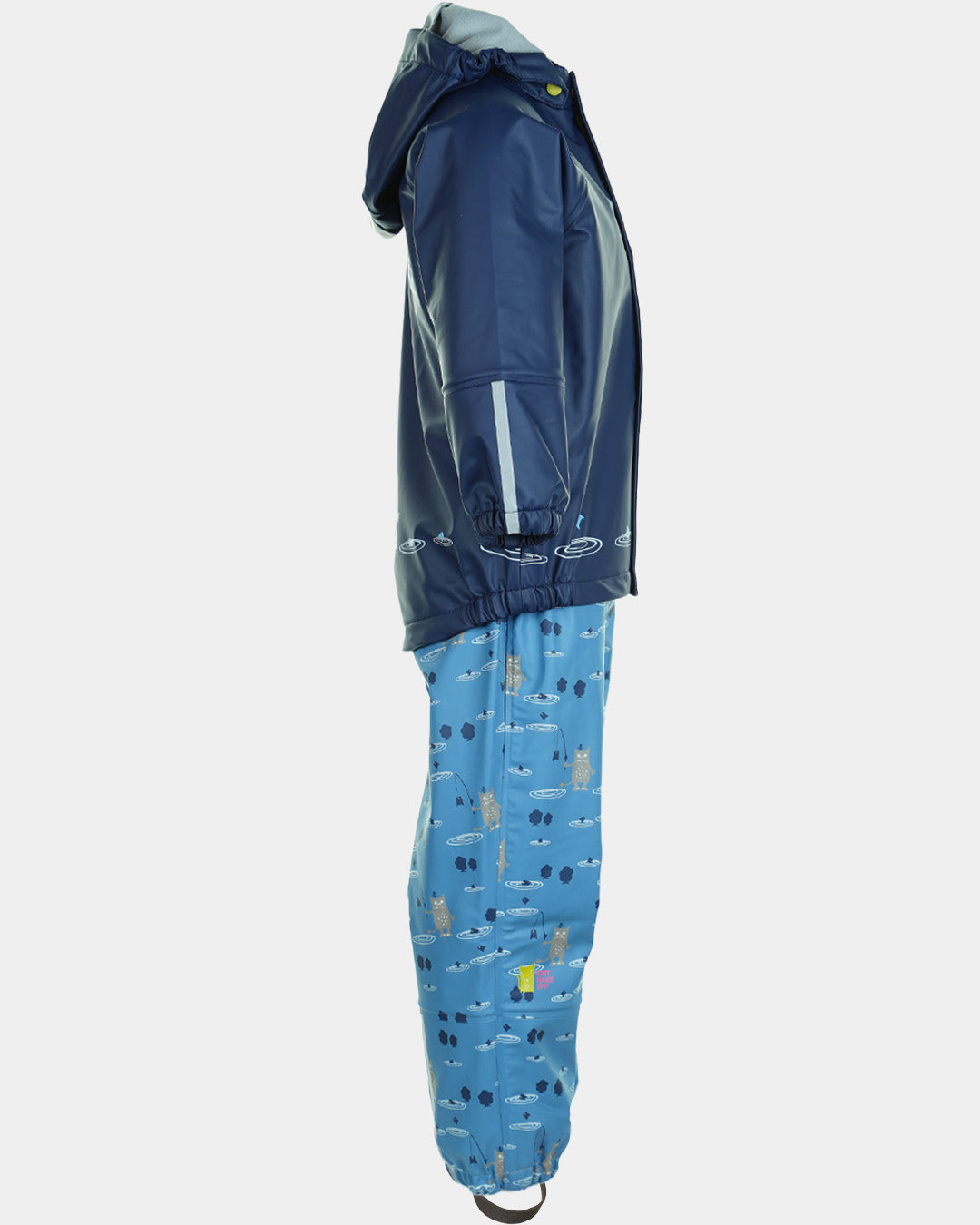 Her er både jakke og bukse i same gode PU kvalitet, med børsta innside. Det er mjuk fleece på insida av kragen og vannstopper finst i både ermer og bein. Her har me slitesterk gummistrikk under føtene, refleksar på jakke og bukse, og mykje moro i print og andre detaljar. Sveisa saumar og sikker hette som er både avtagbar og regulerbar.