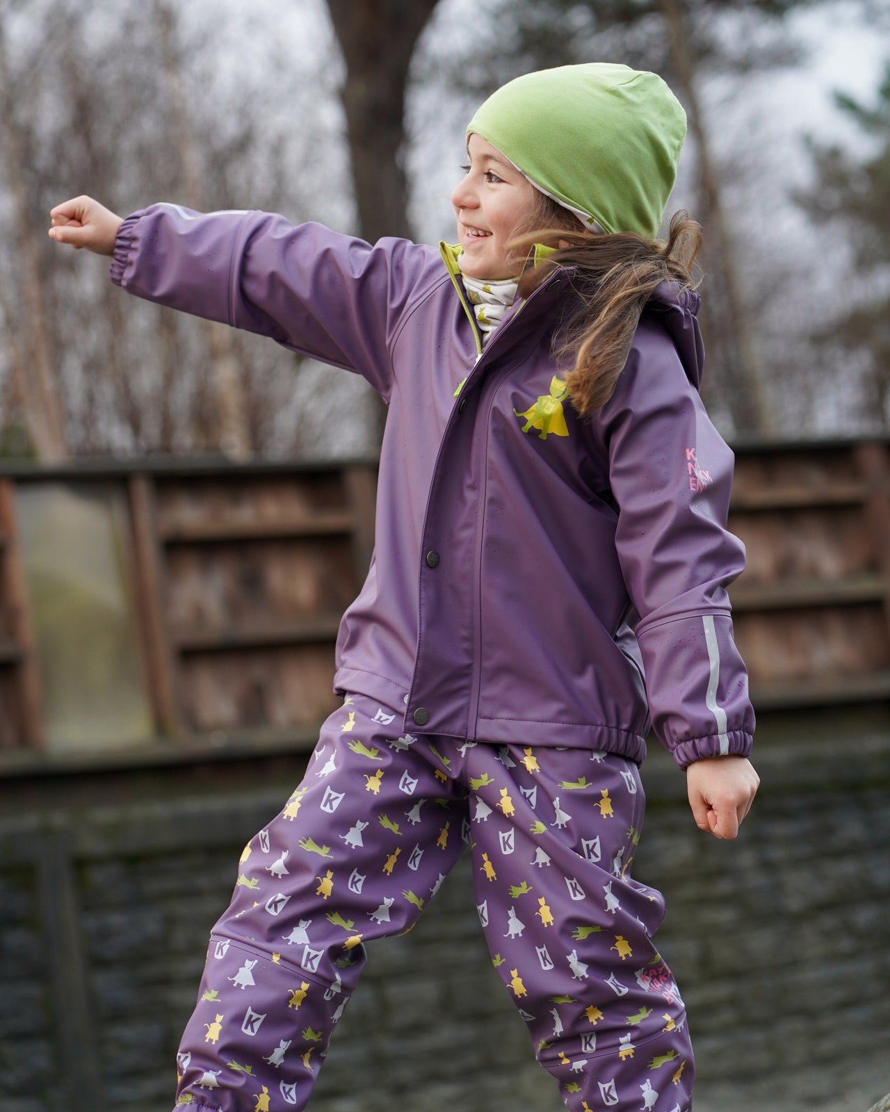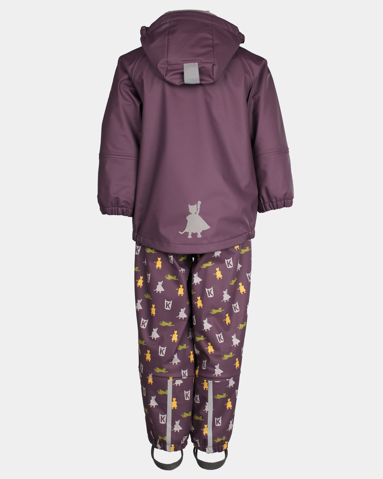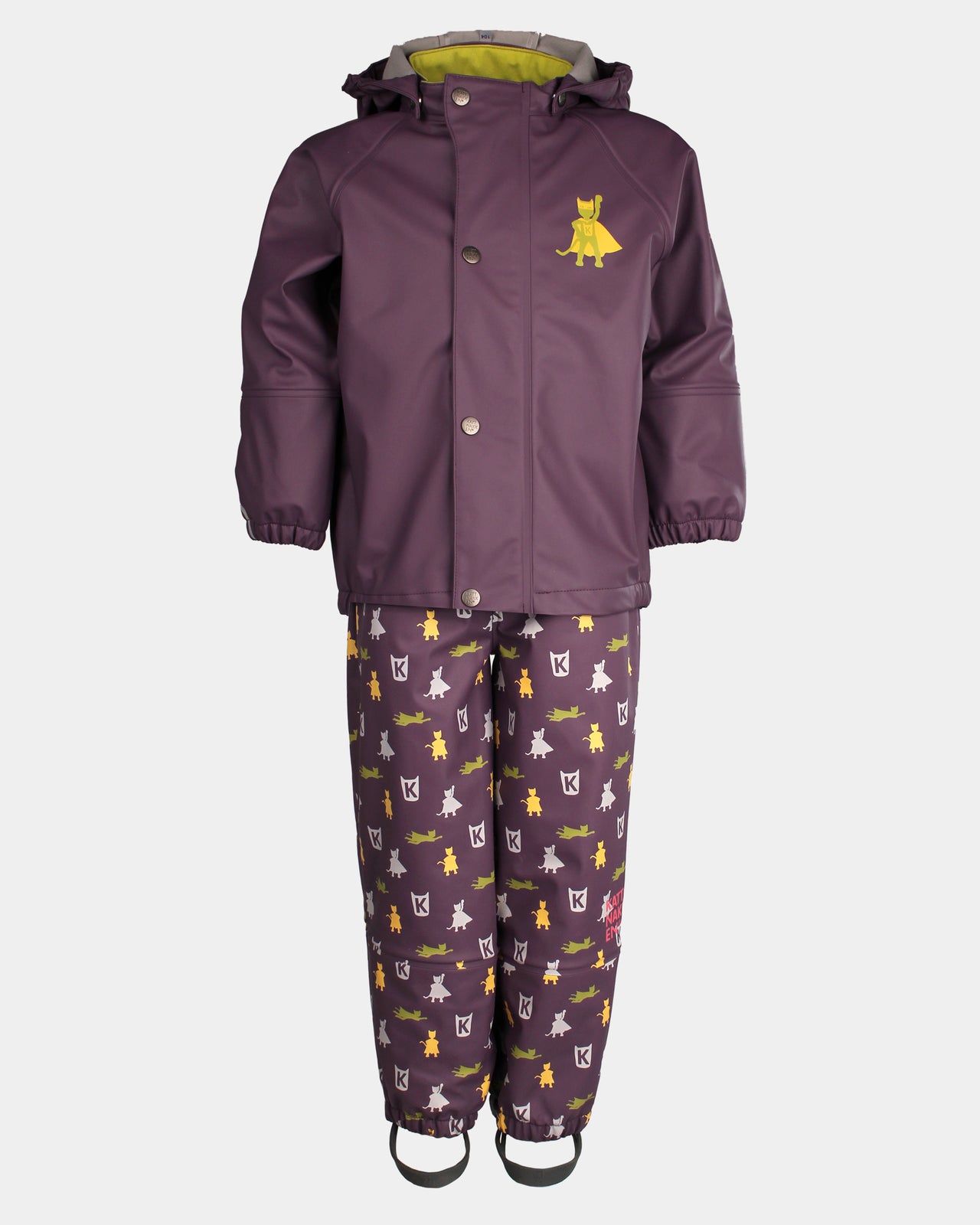 Her er både jakke og bukse i same gode PU kvalitet, med børsta innside. Det er mjuk fleece på insida av kragen og vannstopper finst i både ermer og bein. Her har me slitesterk gummistrikk under føtene, refleksar på jakke og bukse, og mykje moro i print og andre detaljar. Sveisa saumar og sikker hette som er både avtagbar og regulerbar.