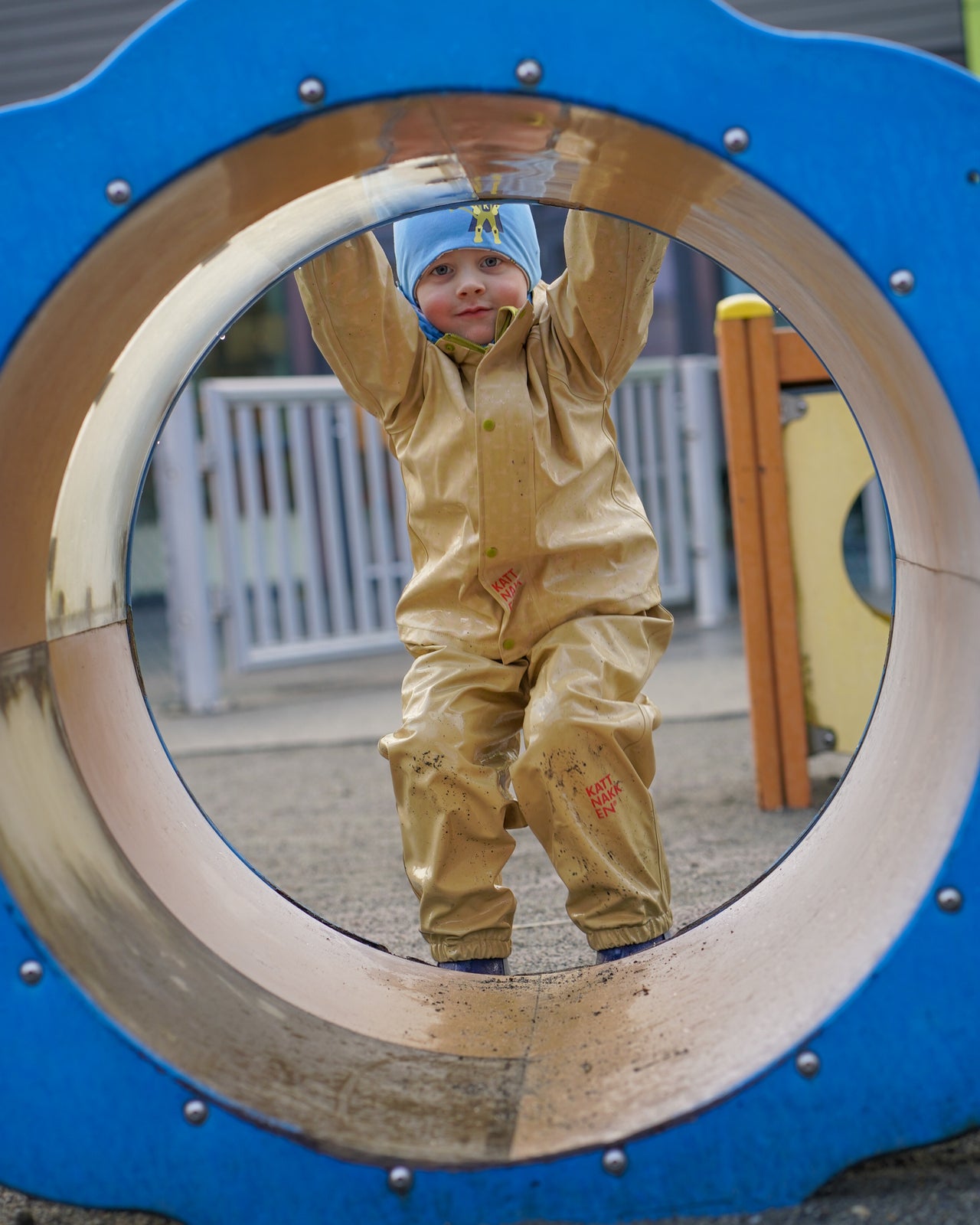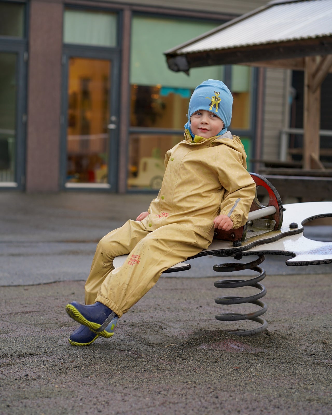 Jakka er som sagt litt tynnare en buksa, men meir enn nok vanntett for ein øs pøs regndag. Jakka har sikkerhetshette og gode refleksar.