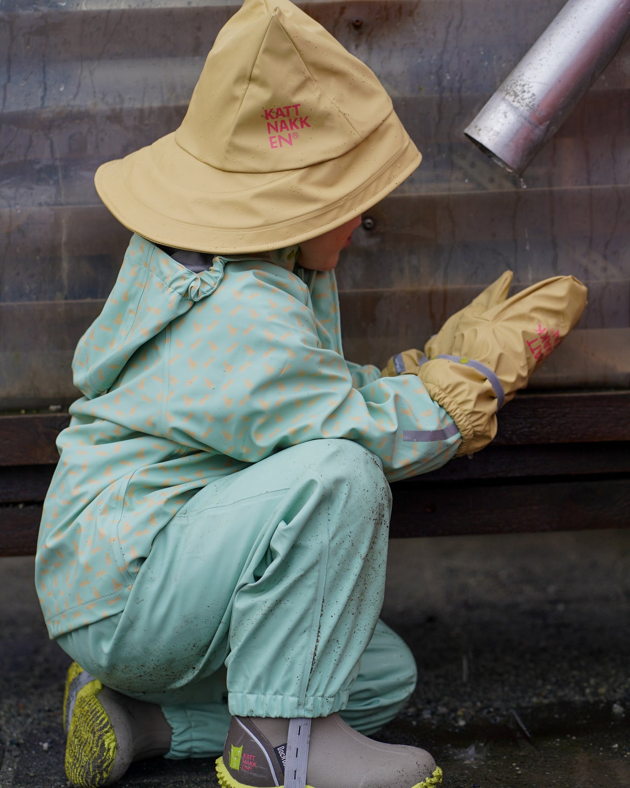 Å leike i vatn er det kjekkaste som er, men fingrane kan fort bli veldig kalde når tempraturen er lav. Difor anbefalar me å bruke regnvottar. Kattnakken sine regnvottar er i mjuk PU med fleecefôr, slik at ein held seg varm. Det er og namnefelt på vottane våre. Dei er lette å ta på og ein kan regulere strikken rundt slik at dei sitt godt på.