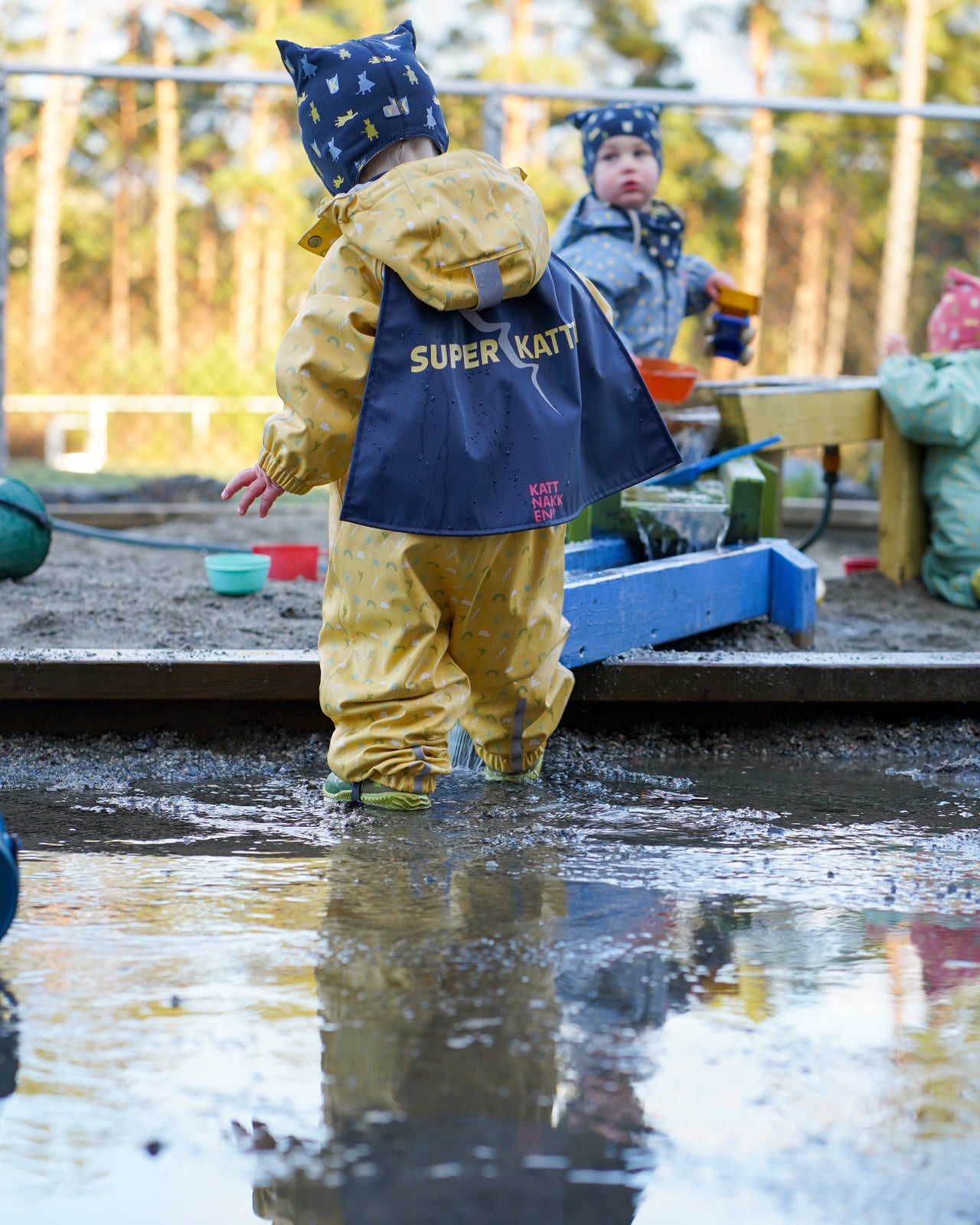 Denne lause superheltkappa frå kolleksjonen Superkatten 2026 kan festast på nesten alt regntøy i kolleksjonen vår (NB! gjeld ikkje Babyregndress Dugg). Me gjer det rett og slett berre på gøy – og fordi det skal vere lov å velje regntøy med eller utan kappe, alt etter humør og superheltambisjonar den dagen.